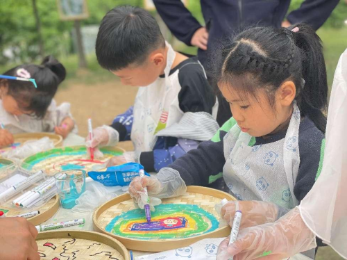 孩子们在古朴的竹匾上创作属于自己的画作,让传统竹制品与天马行空的想象碰撞出绚丽的火花。小胖盯着竹匾思索片刻,率先蘸取绿色颜料,在竹匾中央画下一棵歪歪扭扭的大树,又用棕色颜料添上树干。“这是我家后院的老榕树!”他一边说着,一边在树枝间点缀上五颜六色的小鸟,还在树下画上戴着草帽的自己和蹲坐着的小黄狗。朵朵则被竹匾的圆形轮廓启发,她用蓝色颜料涂抹出圆圆的天空,又用白色颜料点出云朵,接着用金色勾勒出弯弯的月亮和闪烁的星星。有的孩子干脆放弃画笔,用手指蘸着颜料在竹匾上涂抹,留下歪歪扭扭的手印,为作品增添别样的趣味。