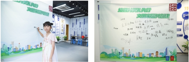 “签下名字,就是答应要做好垃圾分类,也时刻提醒自己讲文明!”志愿者先向大家讲解签名墙的意义——不仅是仪式感,更是对“践行垃圾分类、遵守文明礼仪”的自我约束与公开承诺。随后,居民们有序拿起马克笔,在墙上郑重签下自己的名字:孩子们一笔一划地写,年轻人边签名边和身边人约定“以后扔垃圾一定分好类”,还有社区党员主动在签名墙旁当起“宣传员”,分享垃圾分类小技巧和日常礼仪规范。